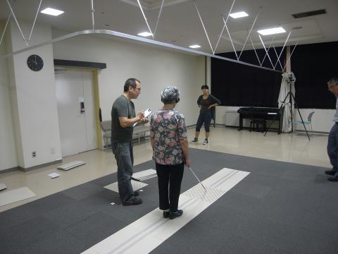 実験条件:被験者はすべてアイマスクをし、こちらが指定した白杖(長さ120cm、チップタイプ)を使用し、振り方はスライドテクニックを指定しました。白杖を振ることによって発生する音(周辺床面とブロックの凹凸差による)が検知に影響する可能性があるため、ホワイトノイズを流したヘッドフォンを着用しました。